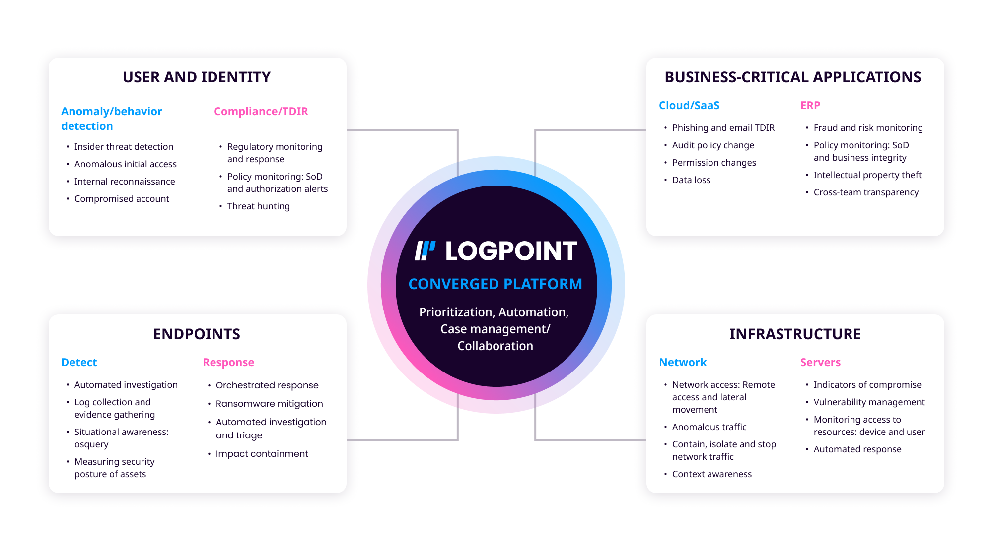 Logpoint SIEM is a comprehensive security intelligence platform that unifies threat detection, investigation, and response capabilities in a single solution. Built to address the complex security challenges facing modern organizations, Logpoint collects and analyzes data across your entire IT infrastructure, including endpoints, networks, cloud services, and business applications, to identify threats in real time.