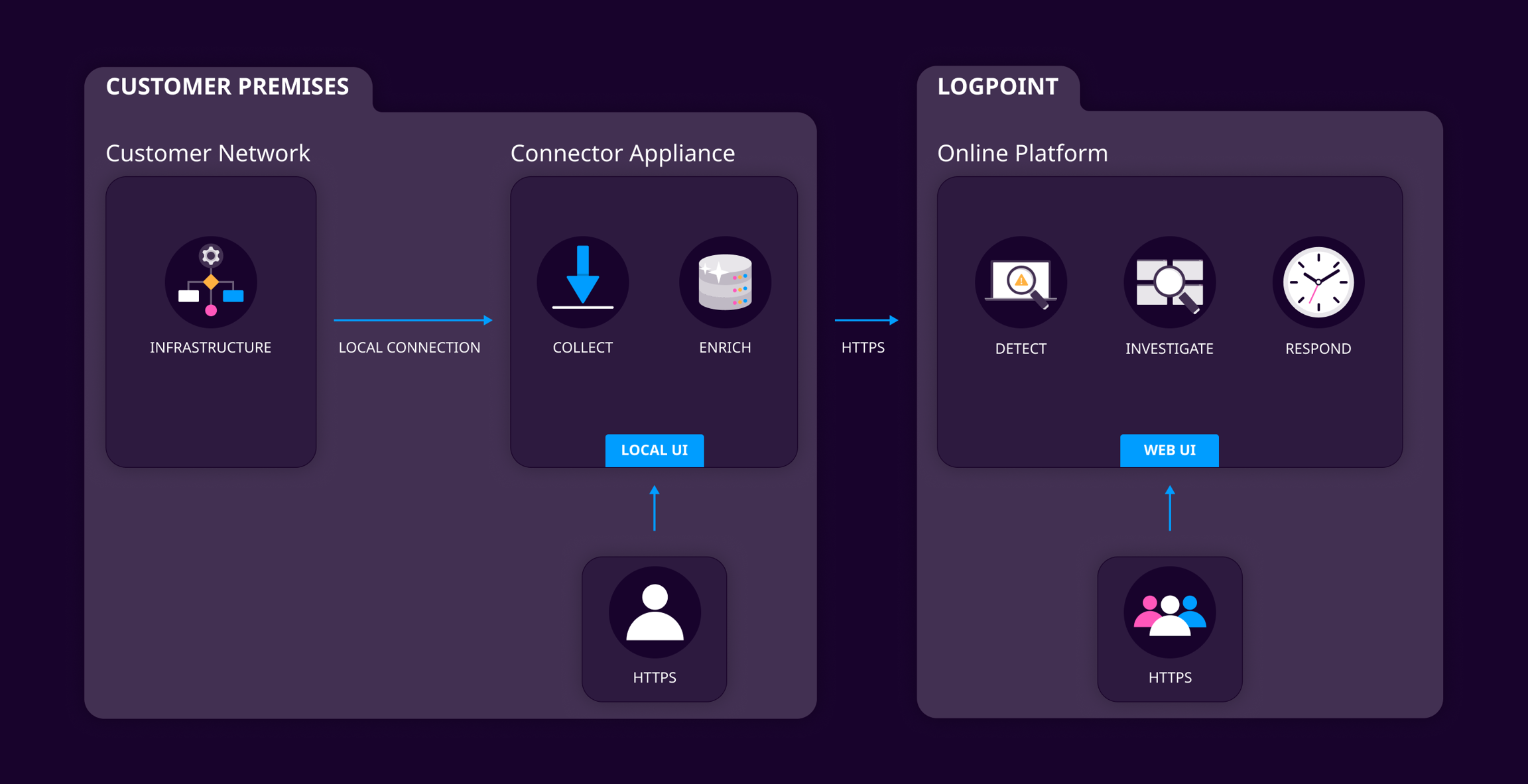 Logpoint SaaS delivers enterprise-grade threat detection, investigation, and response of Logpoint SIEM through a modern cloud architecture. It also monitors your local device’s critical parameters, CPU, memory, disk space, connection health, and log flow, and proactively alerts you in case of service disruptions. By combining cloud capabilities with minimal on-prem infrastructure, it enables security teams to focus on what matters most, protecting their organization rather than managing complex systems.