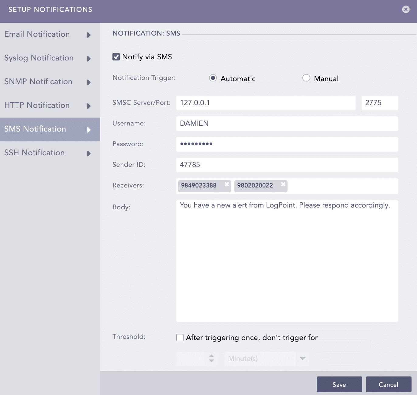 SMS notifications enable users to receive alerts on their mobile devices. Before configuring SMS notification, SMSC server must be accessible from Logpoint.
