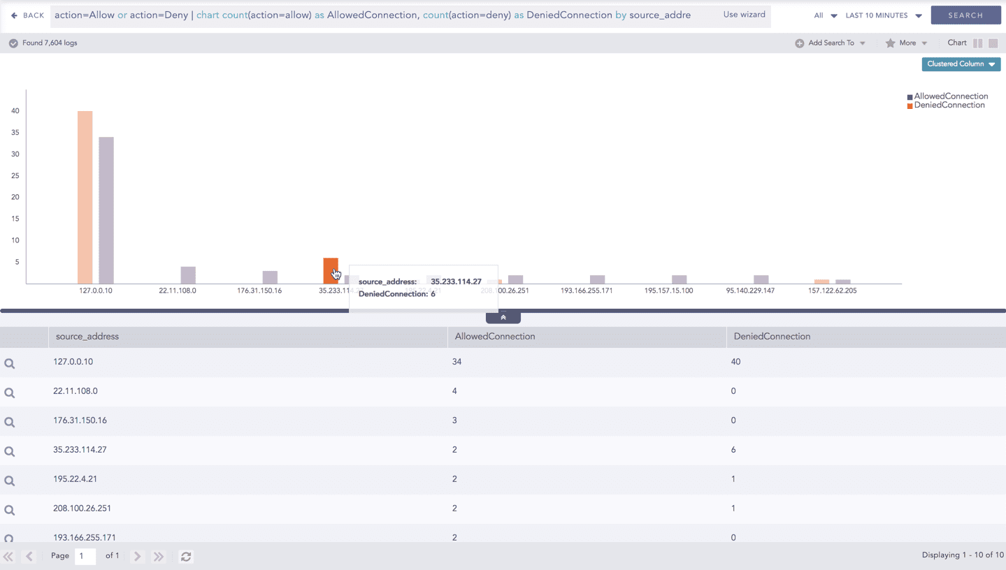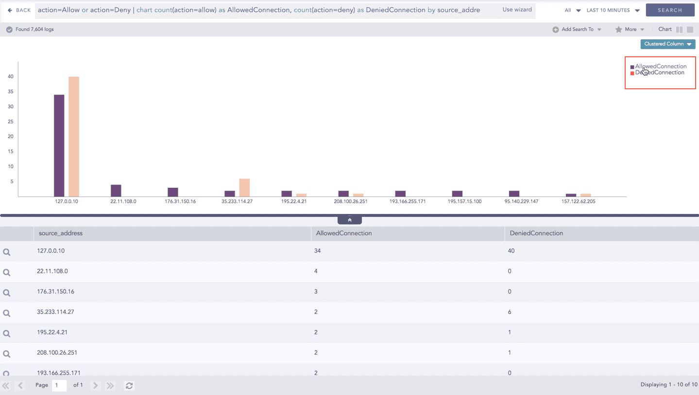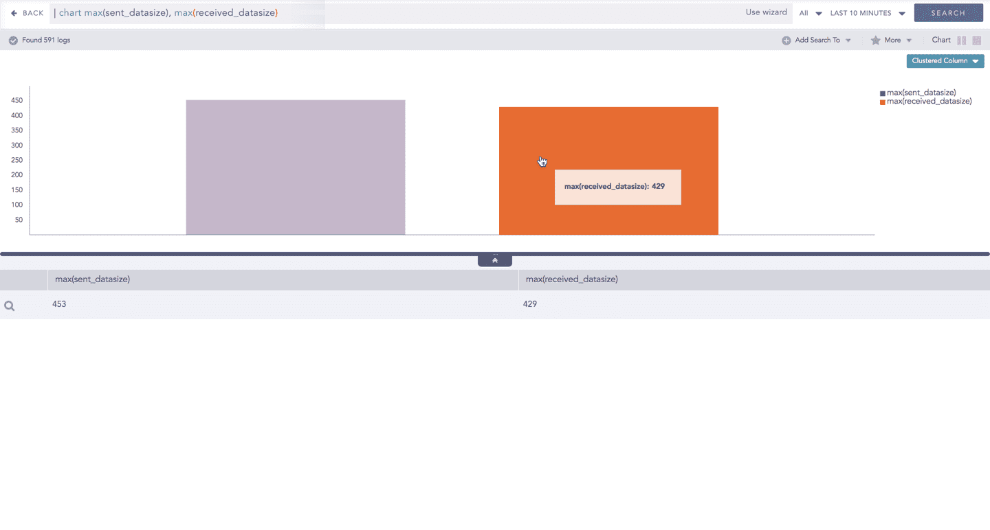 The chart displays the value of the first grouping parameter only when the search query contains a single grouping parameter. When more grouping parameters are used, this value is not shown in the chart but can still be viewed in the Search Table.