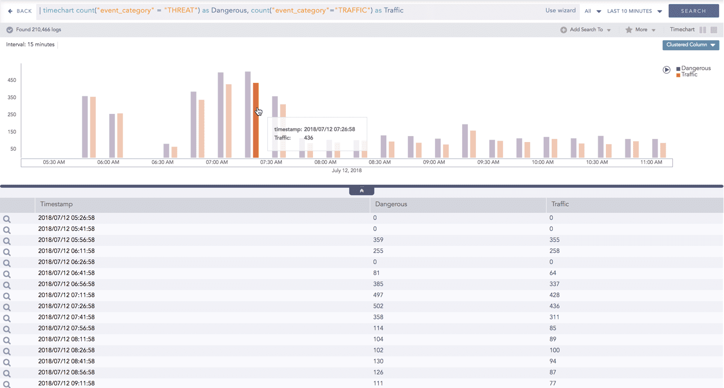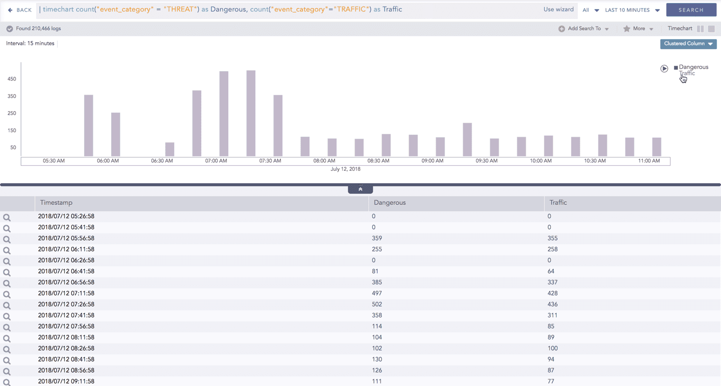 The Timechart Multiple Aggregation without Grouping response type is used for aggregation of processed logs related to the given parameters. The logs are grouped into time buckets (as a time series data) over a specified time-range.