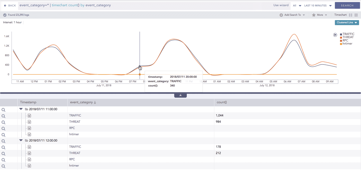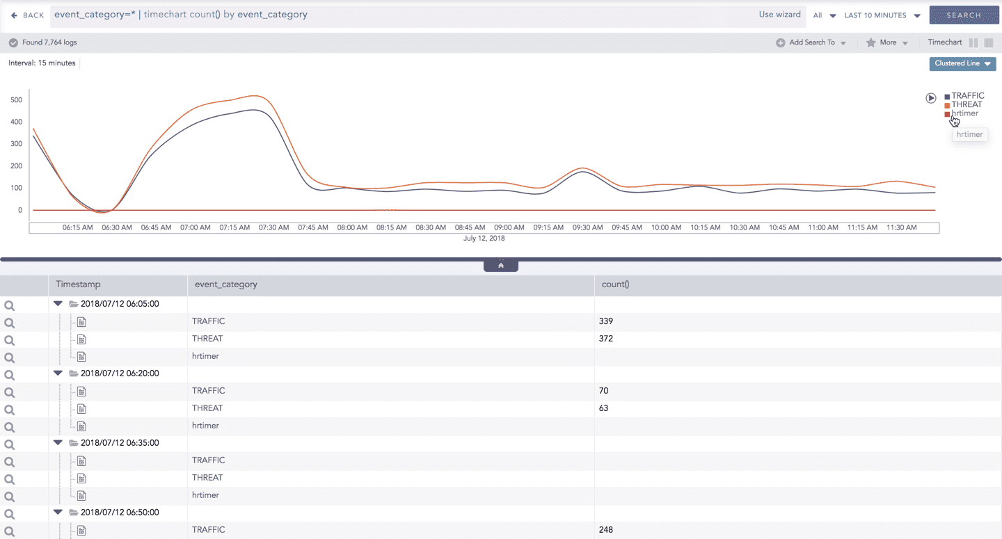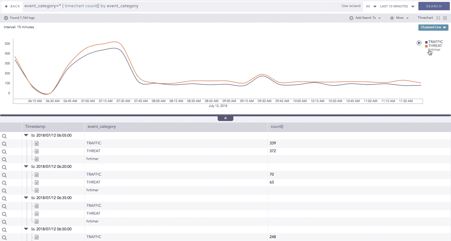 The Timechart Single Aggregation without Grouping response type is used for aggregation of processed logs to a given aggregation parameter grouped into time buckets (as a time series data) over a specified time range.
