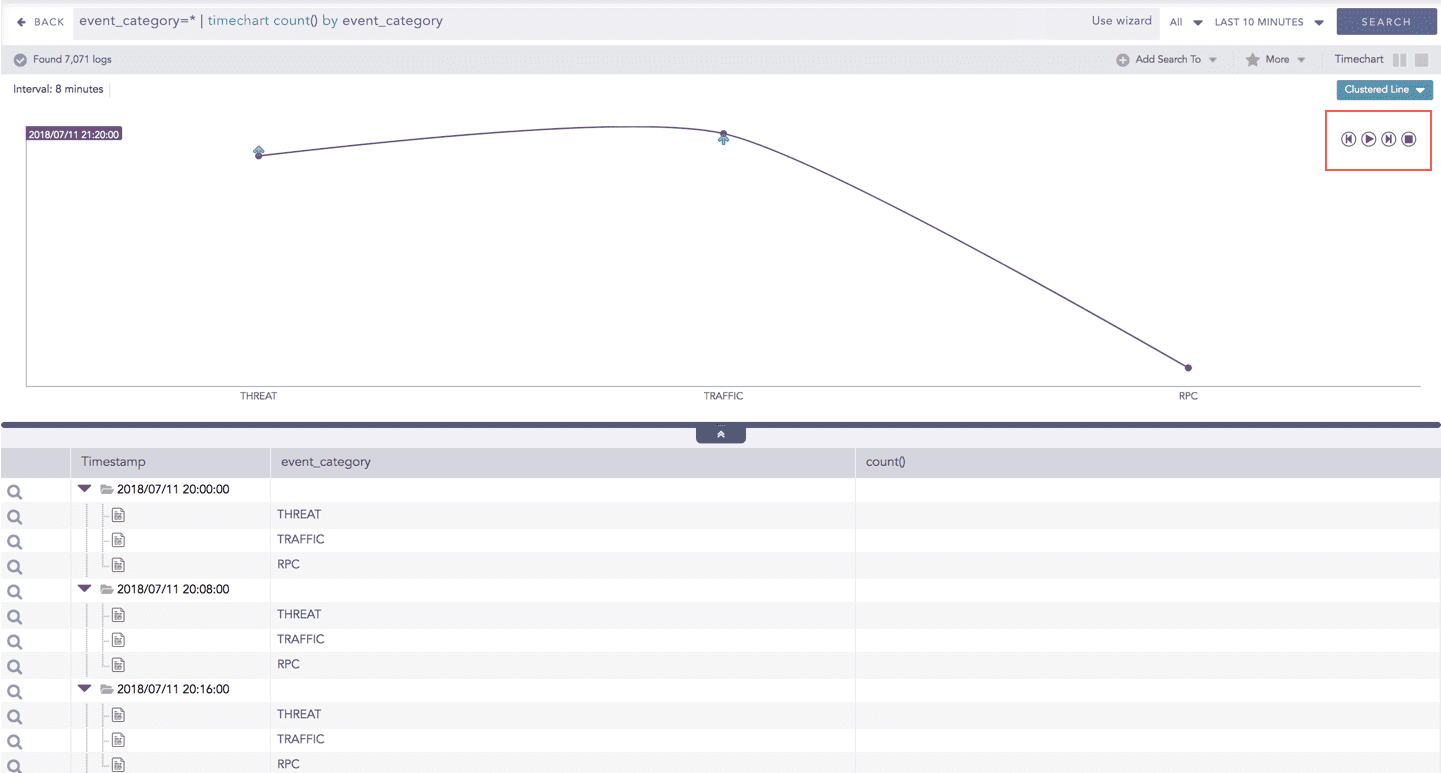 The charts belonging to the Timechart response type include an interactive play button. The button allows you to slide through values of the charts concerning time buckets known as Interval.