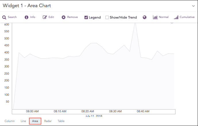 This response type displays the value of the aggregation parameter in the specified range of time. The charts that are used to visualize the queries belonging to this response type are : Column, Line, Area, Day/Hour Heatmap, and Radar.