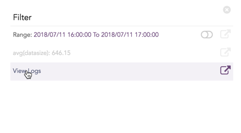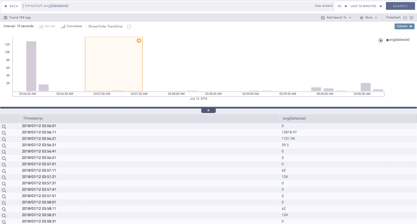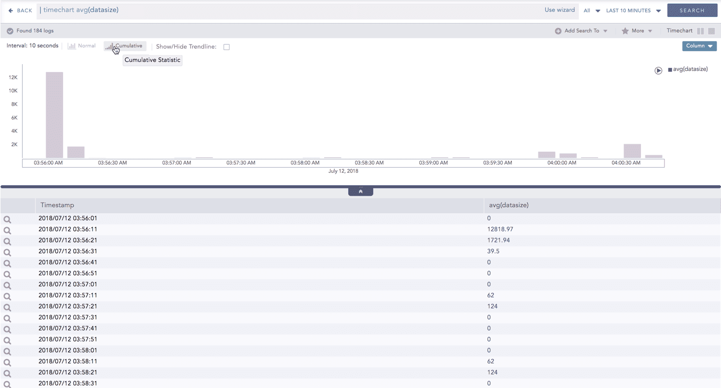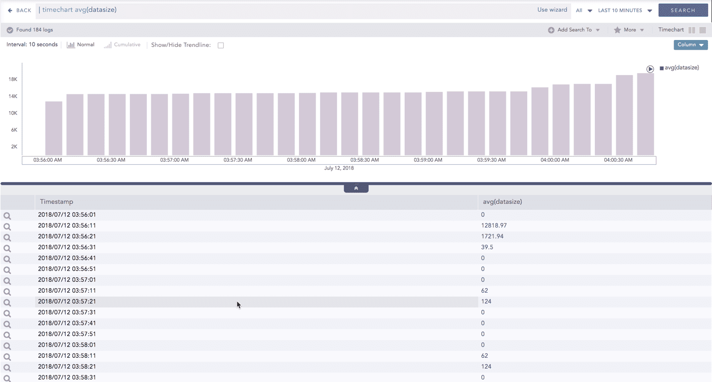 This query displays the total count and the average of datasize of the logs collected in the specified range of time. The result of this query can be represented in the form of :