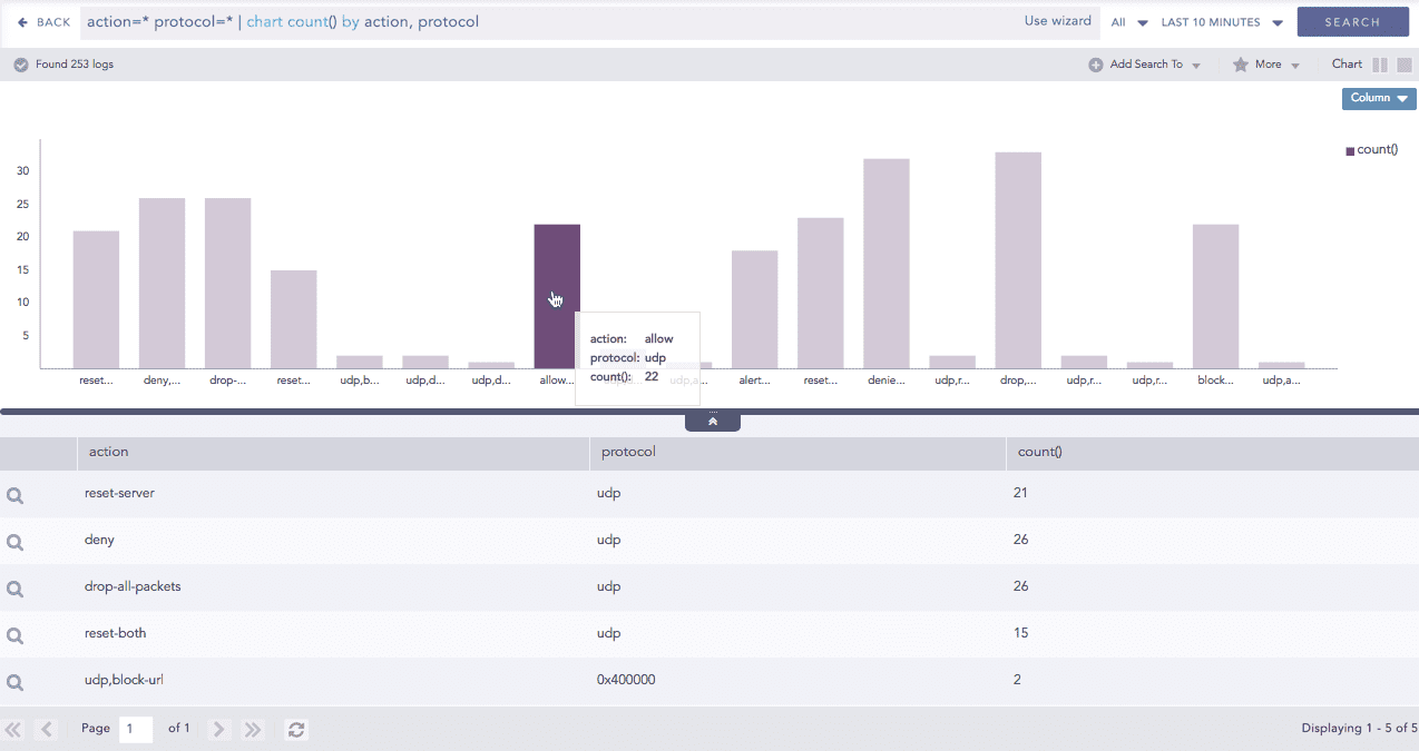 This query displays the count of the logs generated by the individual action, for an individual time bucket over a specified range of time. The result of this query can be represented in the form of :