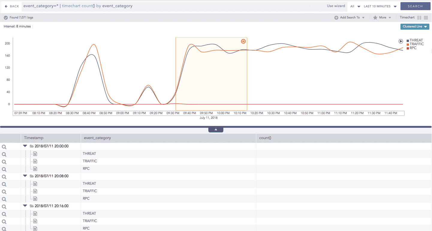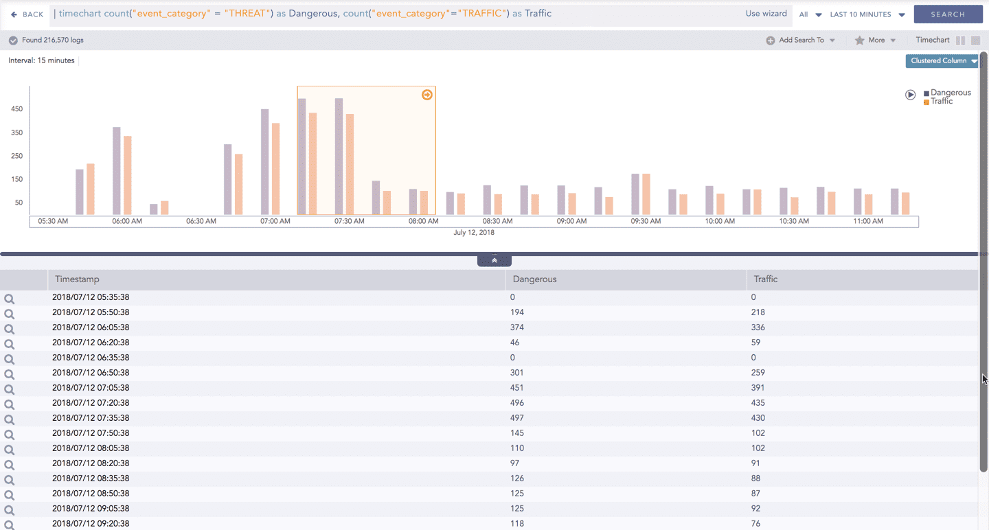 The Timechart Single Aggregation with Grouping response type is used for aggregation of processed logs by an individual grouping parameter concerning given a single aggregation parameter grouped into time buckets (as a time series data) over a specified time range.