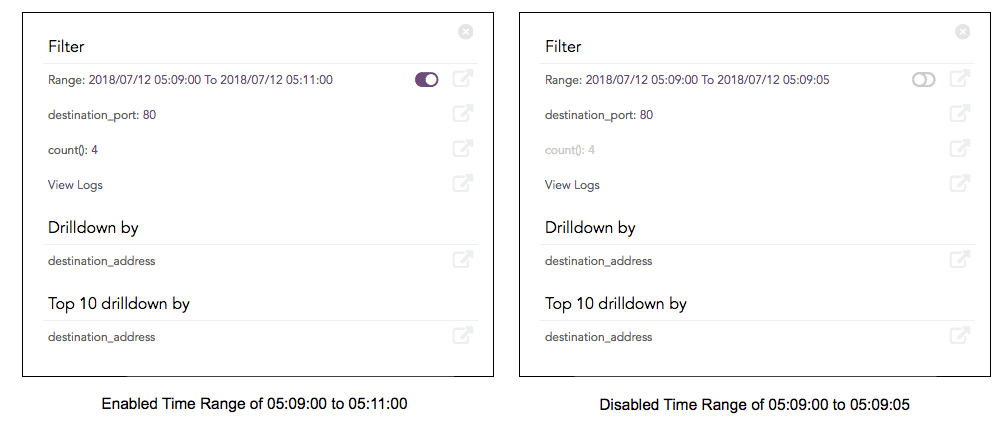 The results of all three drilldown types can be opened and viewed in the same window or a new window. Enable Range.