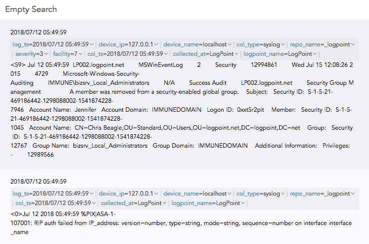 The results of a blank query are only the logs collected for the specified time range; no graphs. You can refine the search query by clicking on specific parts of the search results, for example, a key-value pair or a raw log. This starts a search based on the selected parameter.