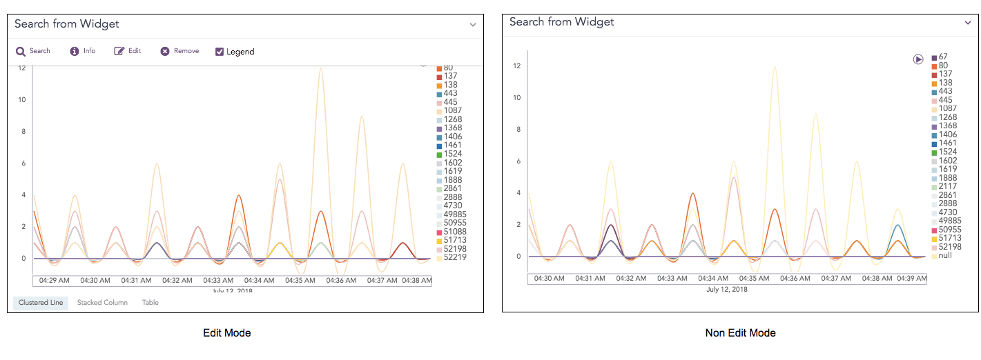 Toggle between edit and non-edit mode. In edit mode, you can select the graph type, for example, Clustered Line Chart, Stacked Column Chart, and Tables. In non-edit mode, you can drill down.