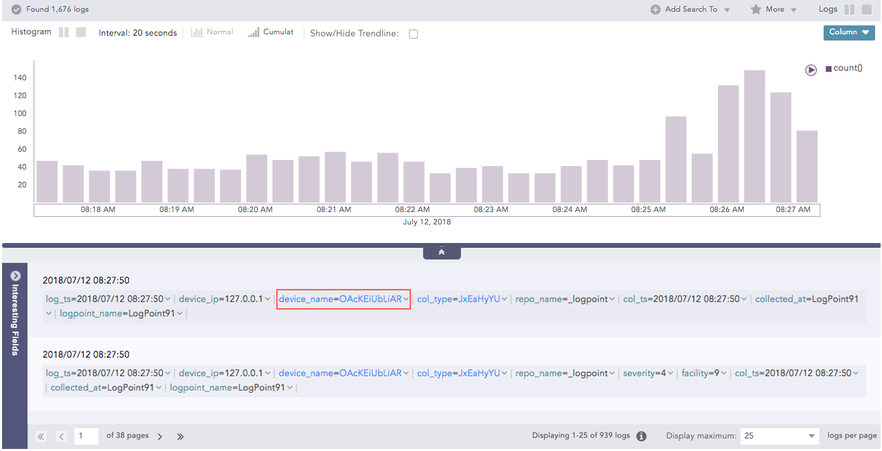 Interesting Fields are the top fields or values found or identified from your search query. After you perform a search using a Simple Search One to One and Filtering Commands, the top 15 fields found most often are listed at the bottom-left.