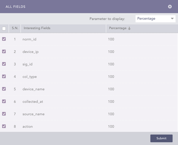 You can sort the list by clicking column headers. The list contains the Fields and their Percentage (%), or the ratio of the field within the overall results. This is the default view. If the percentage of a field is less than 0.005, the number is rounded to 0.