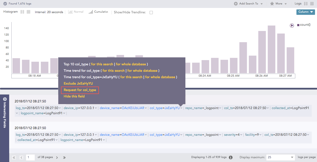 Fields log_ts, col_ts, msg, logpoint_name, repo-name, and label are not included in Interesting Fields.
