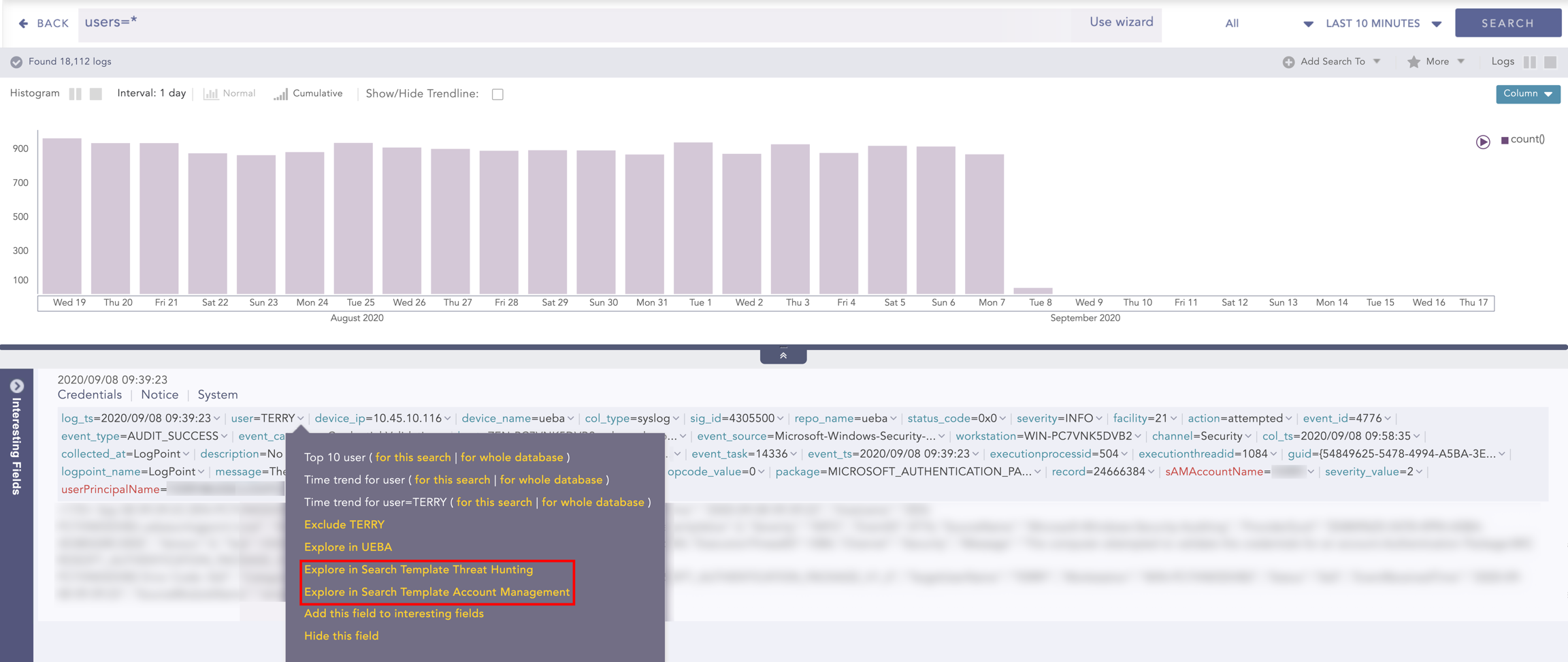 View the top fields or values found or identified in your search query in Interesting Fields.