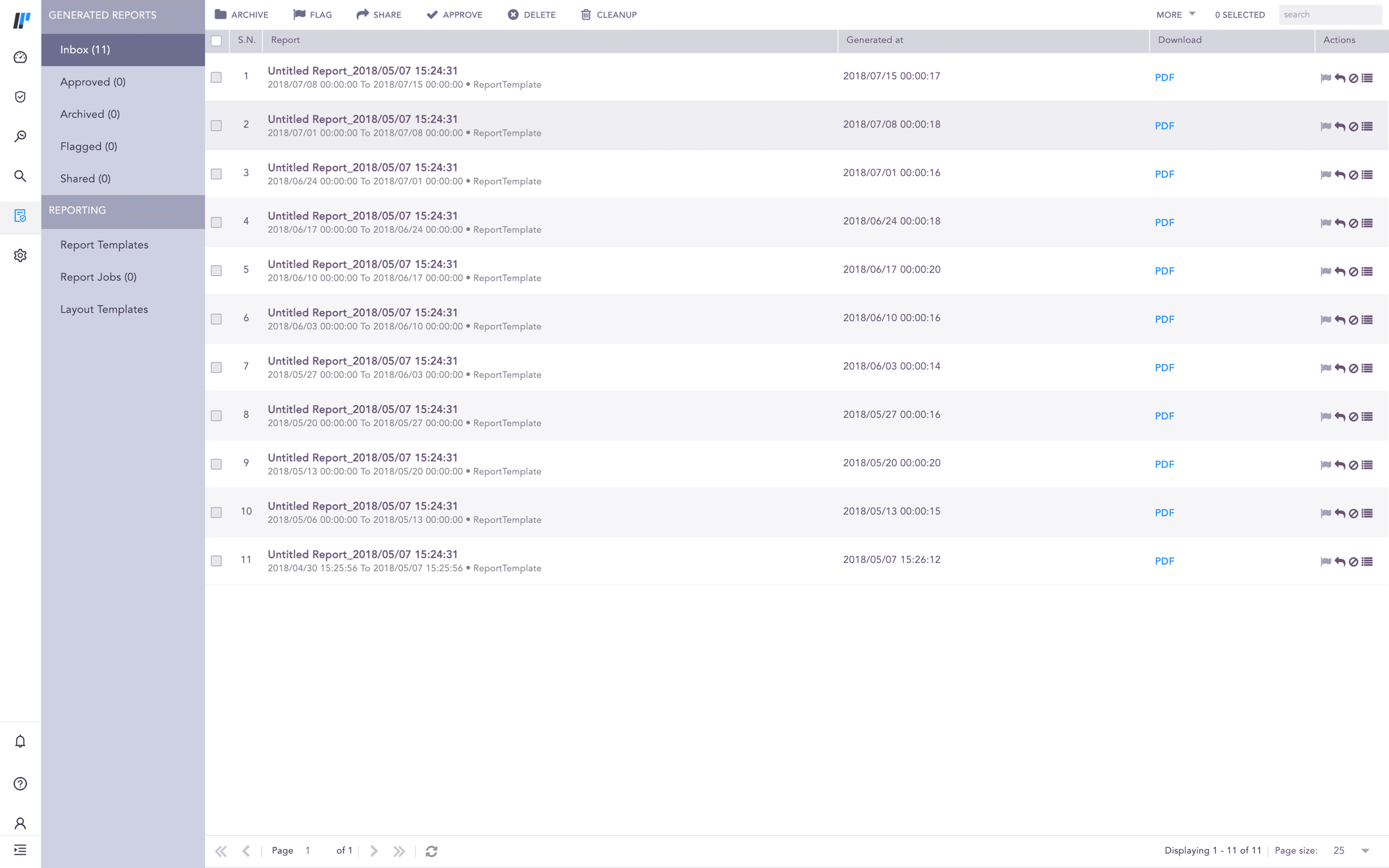 Inbox lists all the successfully generated reports. You can approve, archive, flag, share, or delete a report from the inbox, which is moved into the Approved, Archived, Flagged, or Shared pages or deleted from Logpoint. Important reports must be archived to save the inbox from getting crowded.