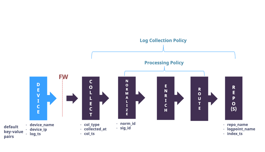 Log Collection Policy and Device: A Log Collection Policy groups the configuration of collector/fetchers, normalization, enrichment, routing and repos that you add to a Device. You can use Log Collection Policies to apply or reuse the same configurations to one or more devices.