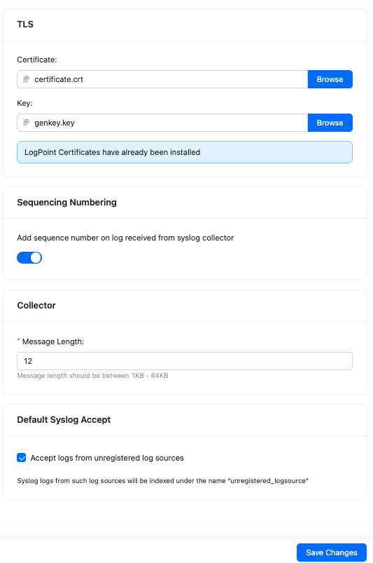 Syslog settings allow you to add a custom TLS (Transport Layer Security) certificate to enable secure log collection via Syslog. The syslog collector uses this certificate to maintain the confidentiality and authenticity of the logs transmitted on port 6514. For information on how to generate the custom certificate and key, go to HTTPS.