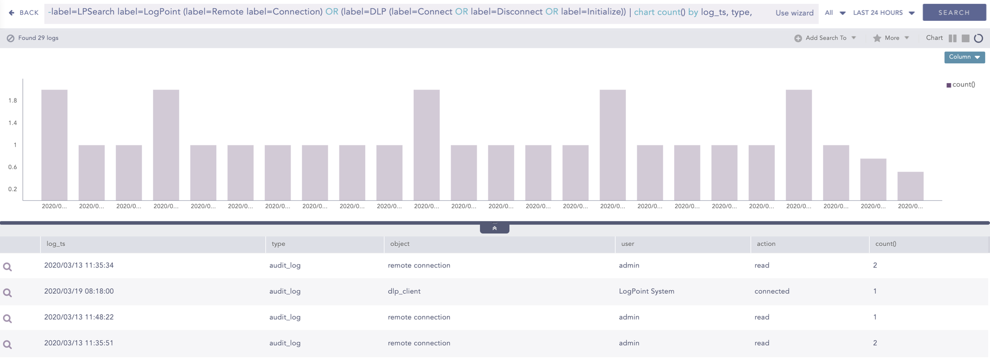 -label=LPSearch label=Logpoint label=User or (label=User label=Management) object=* | latest by object, action | fields log_ts, user, object, type, action, source_address