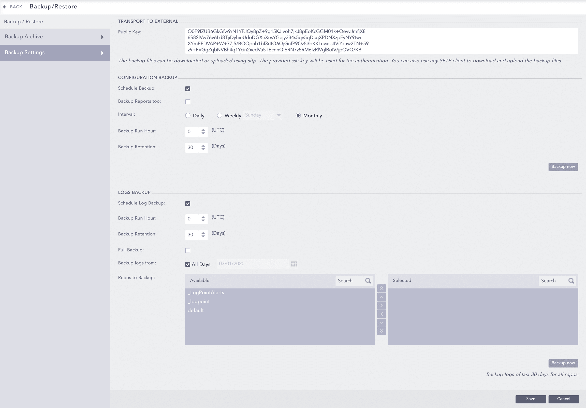 You can restore backup files from Logpoint or an external device by using a public SSH key to access another Logpoint instance or server, and SFTP to transfer the backup files from:
