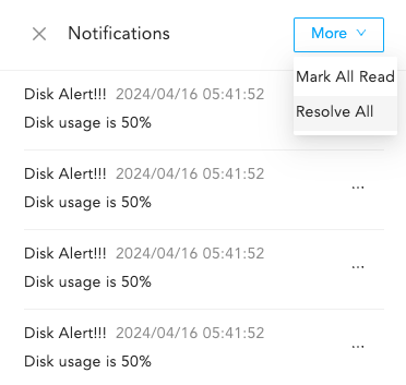 After disk usage is resolved, you need to manually resolve the disk notification. The notifications are still sent even after disk usage is reduced.