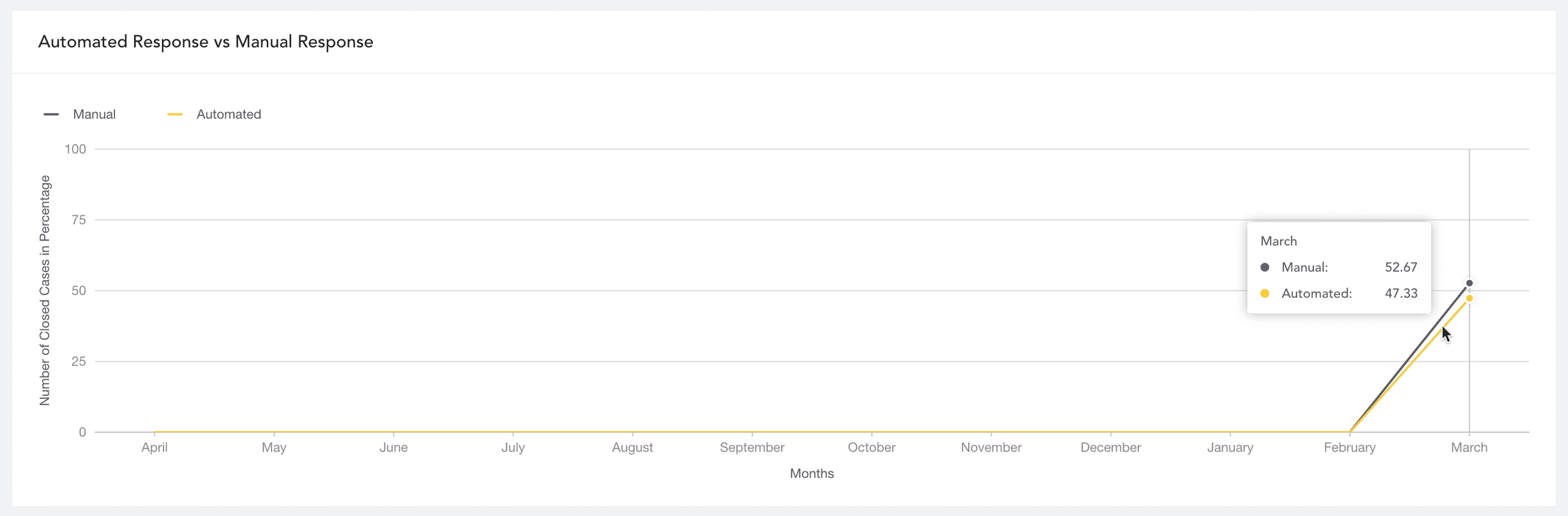 The accumulated data of cases closed by playbooks (automated response) and cases closed by SOC analysts (manual response) monthly in the specified period to assess the case resolution reliability of the playbook so SOC managers can track the efficiency of automation.